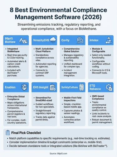 Running a BioMethane operation means juggling emissions tracking, regulatory reporting, and carbon credit documentation, all while keeping your actual processing equipment running smoothly. At 99pt5, we build BioTreater™ systems that guarantee 99.5% CO2e emission reduction, but we also know that proving compliance requires more than great hardware. That's where environmental compliance management software becomes essential.