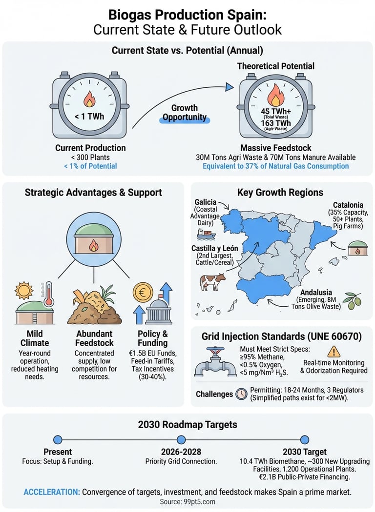 Spain presents a unique opportunity for biogas developers because the country combines massive untapped feedstock potential with ambitious government targets and minimal existing competition. You'll find over 30 million tons of agricultural waste and 70 million tons of livestock manure available annually, yet the country operates fewer than 300 biogas plants compared to Germany's 10,000+. This supply-demand gap creates favorable economics for early movers who can secure long-term feedstock agreements before the market saturates.