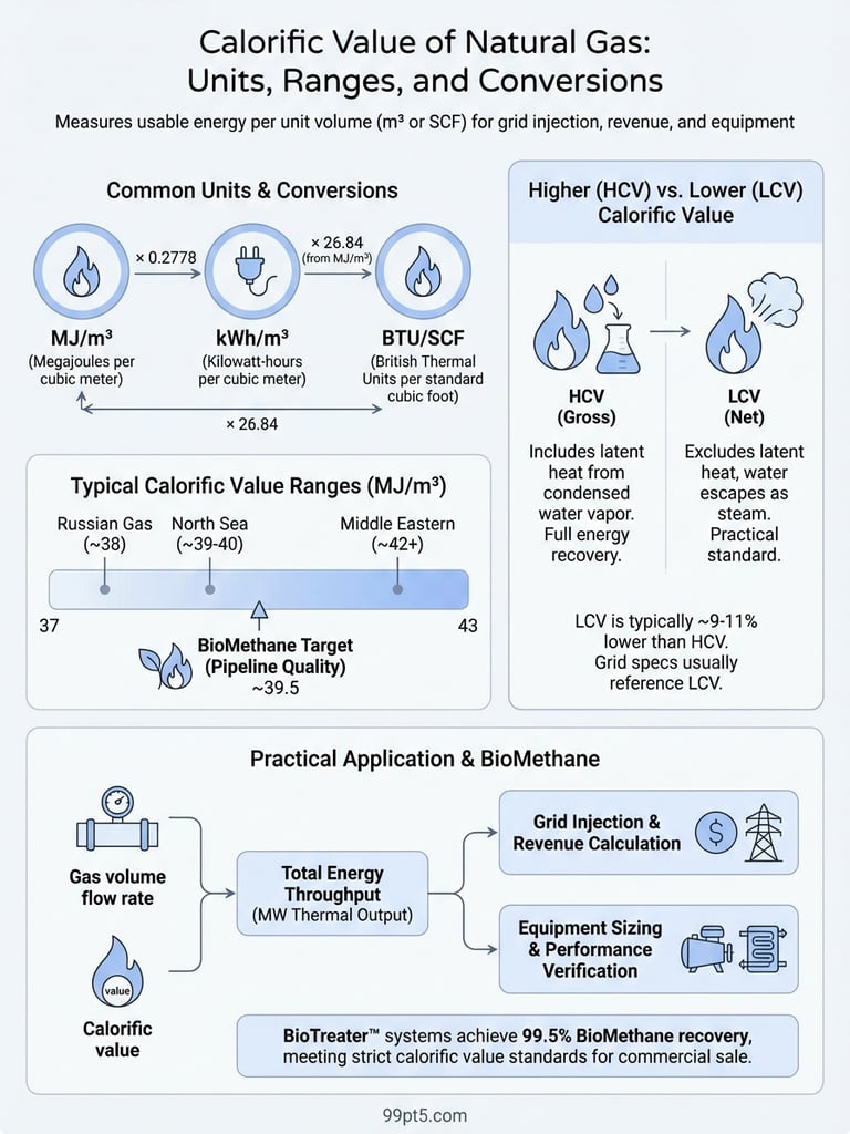 At 99pt5 Ltd, we design BioGas processing equipment that achieves 99.5% BioMethane recovery, producing renewable gas that must meet the same energy content standards as conventional natural gas. That's why understanding calorific values, their typical ranges, and how to convert between units matters for every project we support.