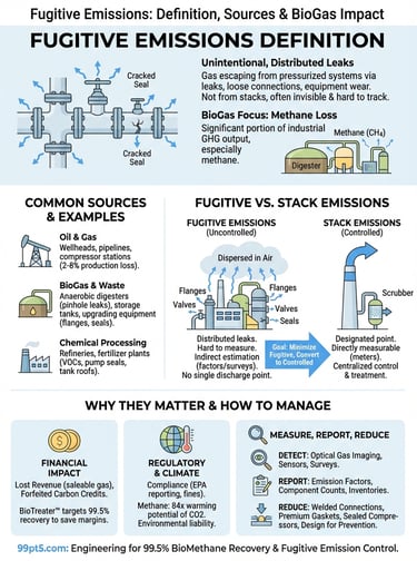 The fugitive emissions definition centers on this lack of deliberate control. When you operate a BioGas upgrading system, for example, raw BioGas enters at elevated pressure. If a flange connection loosens, a valve stem packing wears down, or a compressor seal fails, methane escapes directly into the atmosphere. That escaping methane counts as a fugitive emission because you didn't route it through a burner, scrubber, or monitored discharge point. It bypassed your containment systems entirely.
