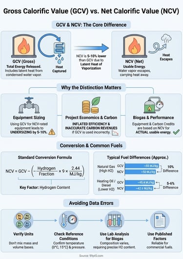 Master gross calorific value vs net calorific value conversions. Understand why NCV is crucial for biogas equipment, performance guarantees, and carbon credit calculations.