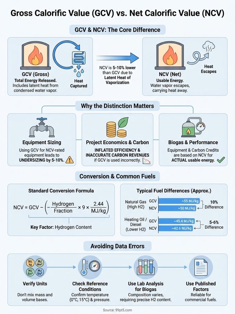 Your equipment specifications, fuel contracts, and performance guarantees all reference one value or the other. Mixing up GCV and NCV creates errors that compound through every calculation. If you size equipment using GCV when the manufacturer lists NCV ratings, you'll undersize by 5 to 10%. The gross calorific value vs net calorific value distinction affects carbon calculations and efficiency reporting.