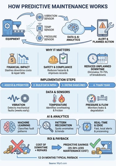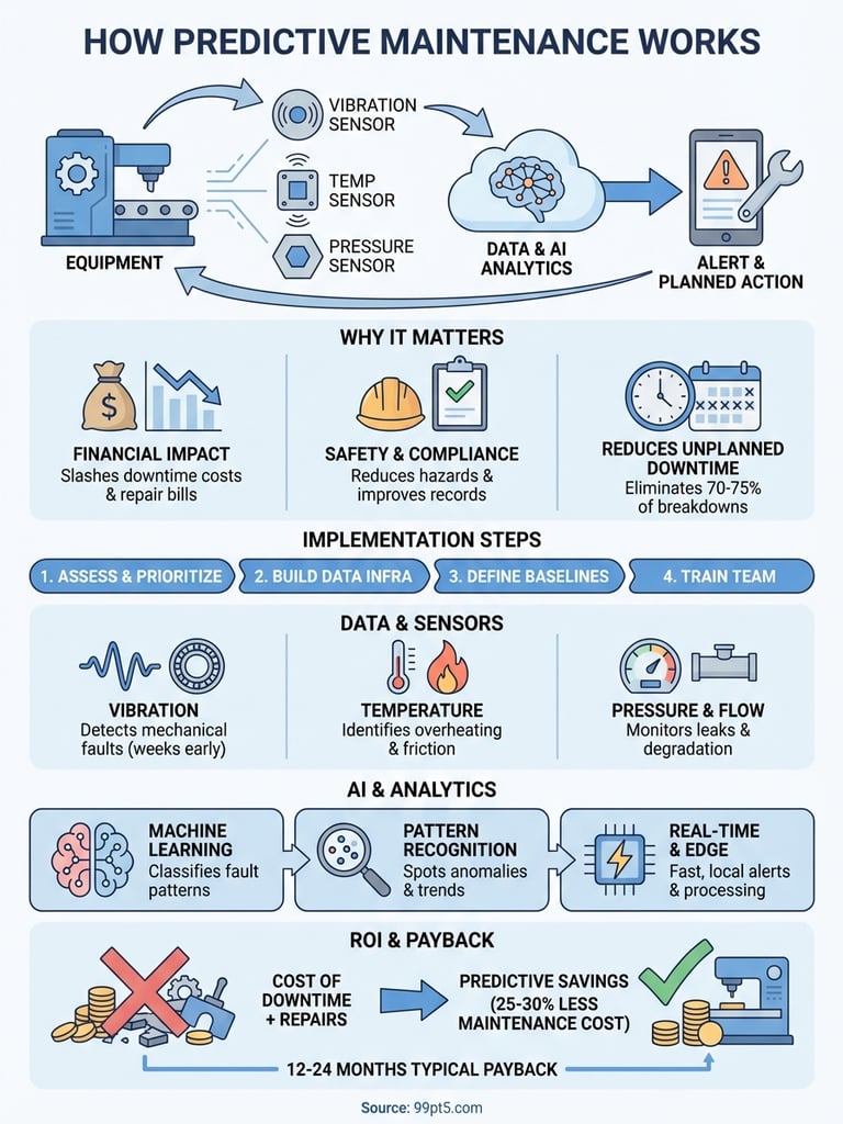 This guide walks you through the practical mechanics of predictive maintenance. You'll learn what sensors and data sources matter most, how to implement a program from scratch, and what AI technologies power the predictions. We'll break down the costs and show you how to calculate your return on investment. By the end, you'll understand exactly how predictive maintenance works and whether it makes financial sense for your operations. The focus stays on actionable information you can use to make better equipment maintenance decisions.