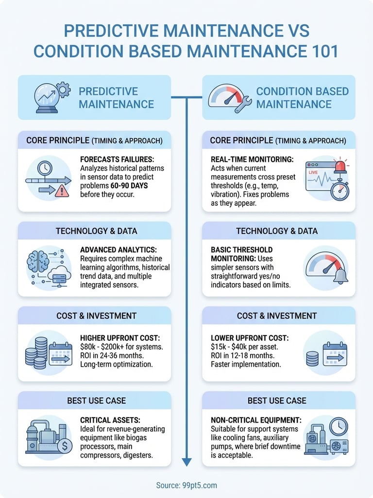 This guide breaks down how each method works, when to use them, and what they cost to implement. You will learn the technical differences between the two approaches, see real examples from biogas and industrial plants, and get practical criteria for choosing the right strategy for your operation. By the end you will know which maintenance approach delivers the best return for your specific equipment and business goals.