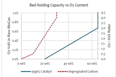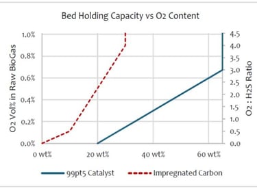 Our catalyst does not require excess air whereas activated carbon requires minimum 4x O2:H2S ratio to perform correctly. The result, 99pt5 guarantees O2 content in BioMethane will not exceed the sales specification. In contrast, activated carbon based systems more-often-than-not contain elevated O2 levels which are above the sales specification, which can be potentially explosive, especially under pressure.